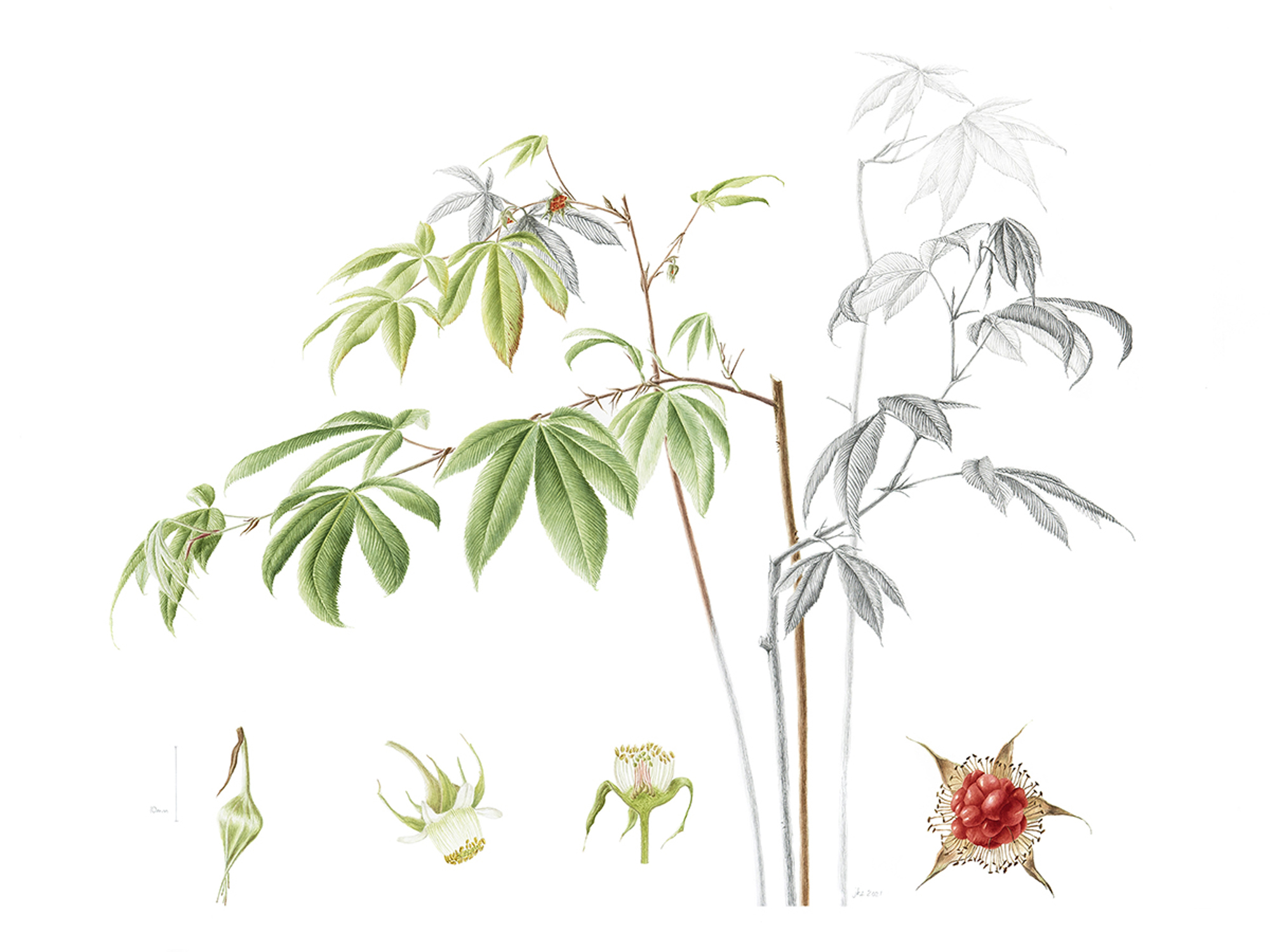 My idea developed after studying Stella Ross-Craig’s drawings in “Drawings of British Plants”. In this book, she illustrated in pen and ink 17 plants of the many Rubus genus growing naturally in the British Isles. There is a lovely description of how she observed, collected specimens and fruits from her chosen plants before other “two-legged predators” ate valuable information. My collection comprises two non-UK native species, a wild UK native and two cultivated species. I chose to concentrate on leaves, prickles and stems in particular, along with the details of the flowers and fruits.