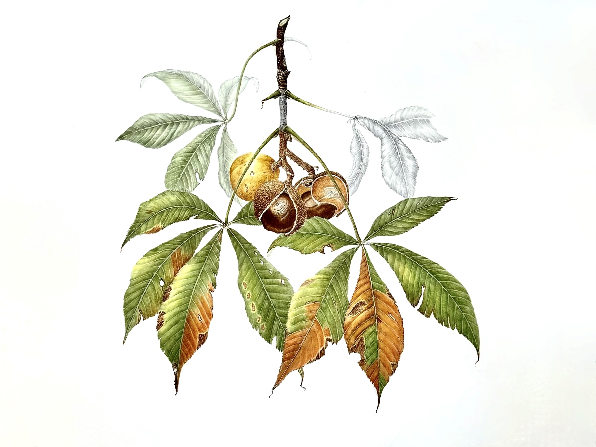 Showing fall leaves and different aspects of the final maturation of nuts is the focus of this set of paintings.