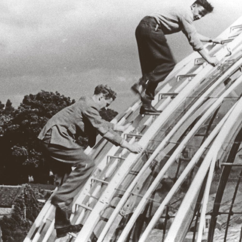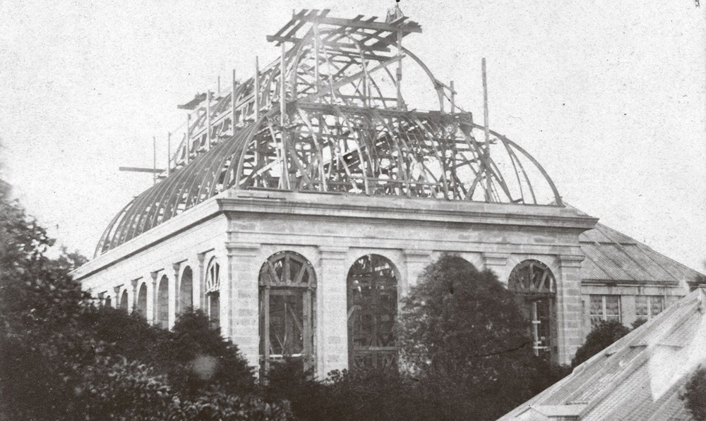 A new roof made of cast iron and glass matching the dome of the new Palm House is built on the old one.