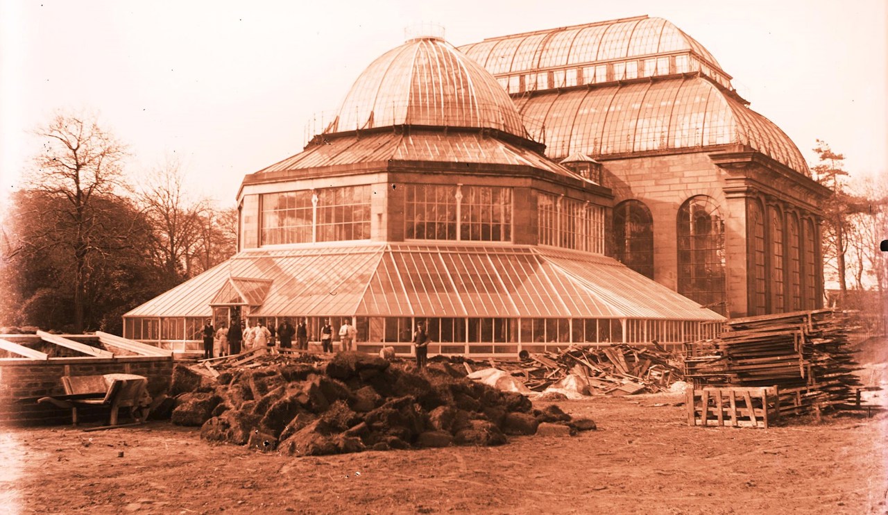 Designed by Robert Matheson, the glasshouse cost £6,000 and was largely built of sandstone quarried at Bishopriggs, near Glasgow, with a roof of curvilinear iron rafters. The principal gardener at the time was a man called James McNab, who believed that solid masonry prevented rapid cooling and provided shade for the successful cultivation of plants; he also argued that too much sunlight was not good for growing palms, hence the front of the glasshouse was made to face west.