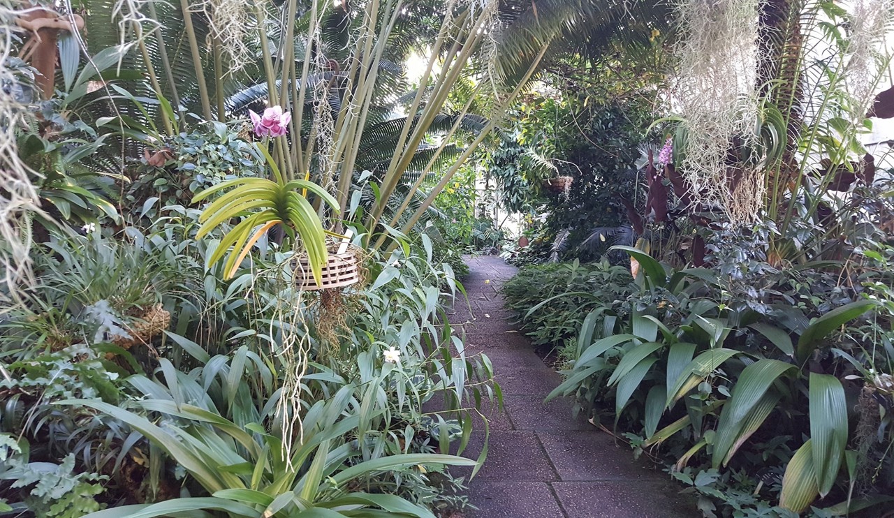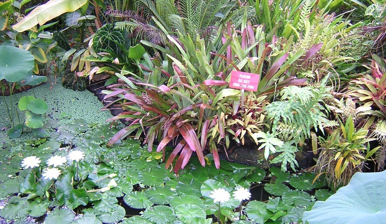 Experience the hot and humid atmosphere of the South American rainforest. A range of exotic climbers, many of which have extraordinary flowers, festoons the walls and railings that overlook the pool brimming with carp. Featuring prominently are the bromeliads - a large family of over 2,000 species, of which the most familiar is the fragrant pineapple (Ananas comosus). Known as 'urn plants', their leaves spiral around a central hollow in a nest shape, storing water for the plants and creating a reservoir for other life forms, such as the tree frog. In late winter the bright red pompom flowers of the Calliandra haematocephala provide a splash of colour.