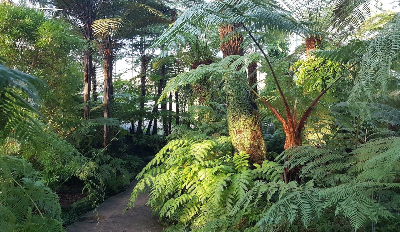 The grove of tree ferns around the cascading stream in the centre of the house echoes the montane cloud forests of temperate Australasia. These tall-growing species, which can reach up to 20 metres, provide shelter for other delicate species and under-storey ferns that demand protection from high light levels. You will also find a giant horsetail (Equisetum myriochaetum) here - it's as invasive as the garden weed and is contained within a concrete planter.