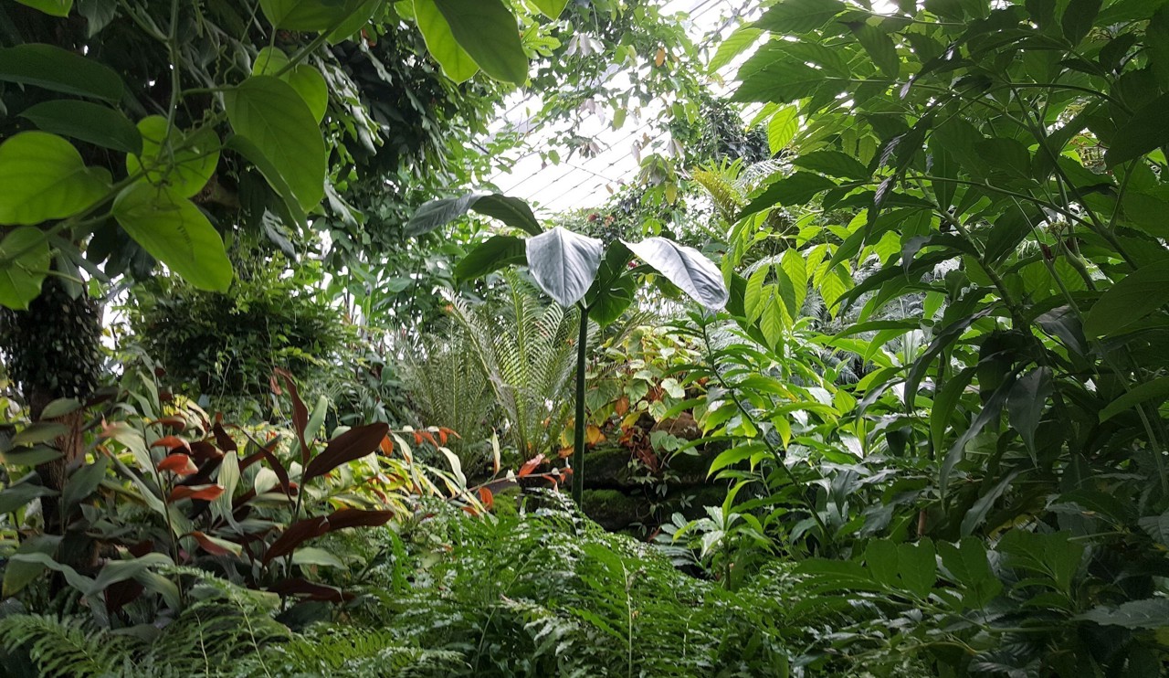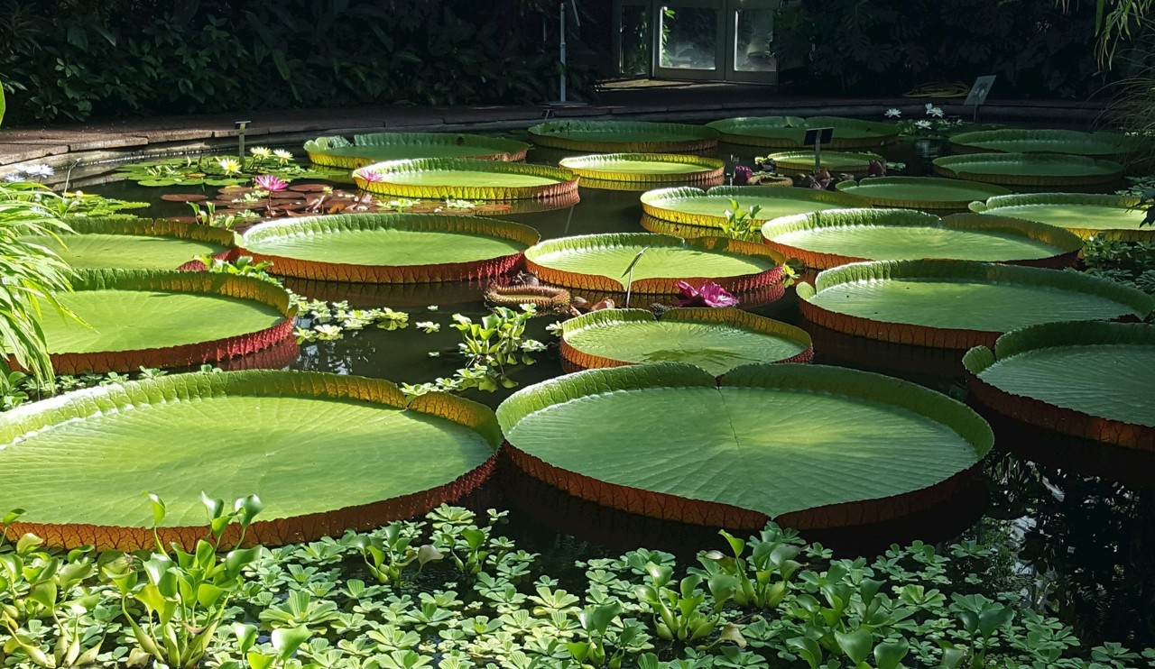 Here luxuriant tropical rainforest vegetation and economical plants - including bananas, rice, sugar and cocoa - surround the central pond. In the summer the pond is dominated by the huge floating leaves of the giant water lily (Victoria species), which thrives in the high humidity and hot conditions of this house. Although giant water lily plants is a perennial in the wild, they cannot be sustained all year round so far north due to the low winter light levels. Instead, fresh seed is sown each year in January to produce new plants.