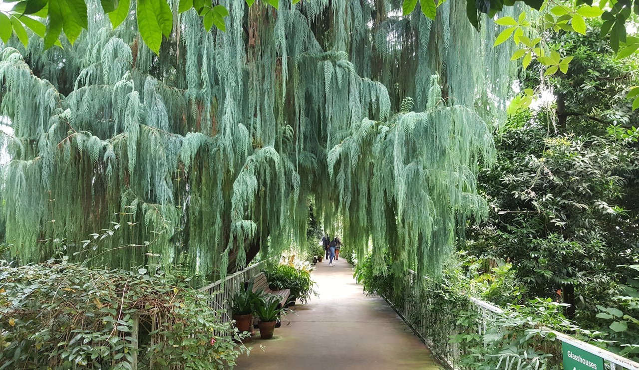 The great expanse of this house is a direct result of the external supports designed into the Front Range by the architects for the Department of the Environment in 1967; the design maximises the light available to the plants and provides a pillar-free internal area which is landscaped to create an atmosphere of exotic habitats. The bridge that stretches end to end gives wonderful views down onto the lower level. The house features plants from warm, moist evergreen forests, such as the Japanese blue oak (Quercus glauca) and the kauri (Agathis australis). Beneath these are many shade-loving plants such as begonias, hedychiums and ferns, which thrive in the dappled shade.