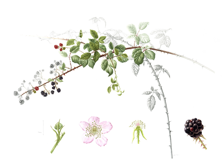 My idea developed after studying Stella Ross-Craig’s drawings in “Drawings of British Plants”. In this book, she illustrated in pen and ink 17 plants of the many Rubus genus growing naturally in the British Isles. There is a lovely description of how she observed, collected specimens and fruits from her chosen plants before other “two-legged predators” ate valuable information. My collection comprises two non-UK native species, a wild UK native and two cultivated species. I chose to concentrate on leaves, prickles and stems in particular, along with the details of the flowers and fruits.