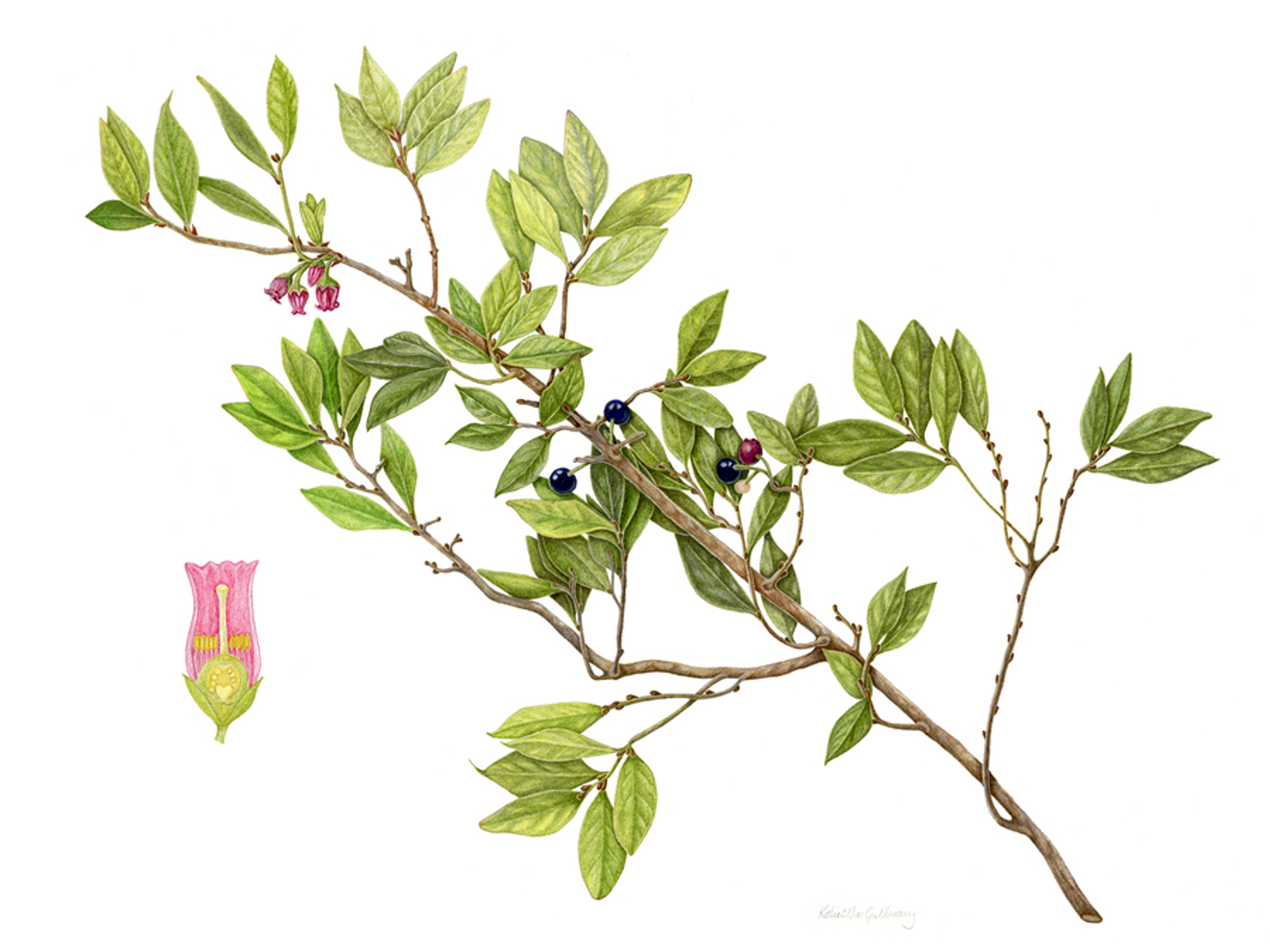 My final project of five plants in the Ericaeae family was a delight to accomplish. I literally have all of these plants right outside my front door and in the woods on my wee island off the coast of Maine. All of the species illustrated have bell-shaped flowers that the native pollinators adore. The best bit is that most of these plants produce edible berries that are a significant staple in New England.