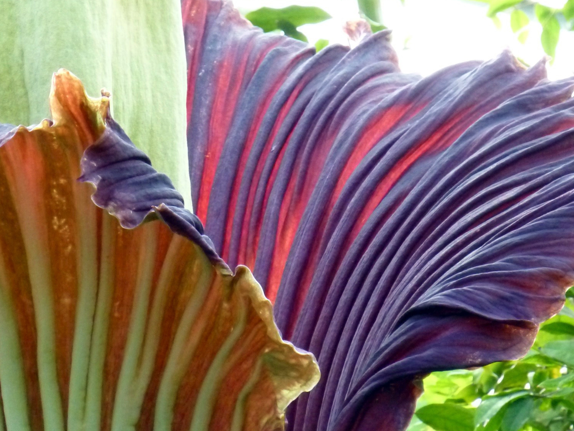 Everything about Amorphophallus titanum is big. The inflorescence stands three metres tall, whilst the single leaf reaches a height of six metres and a spread of five metres, resembling a small tree rather than the herbaceous plant that it actually is.