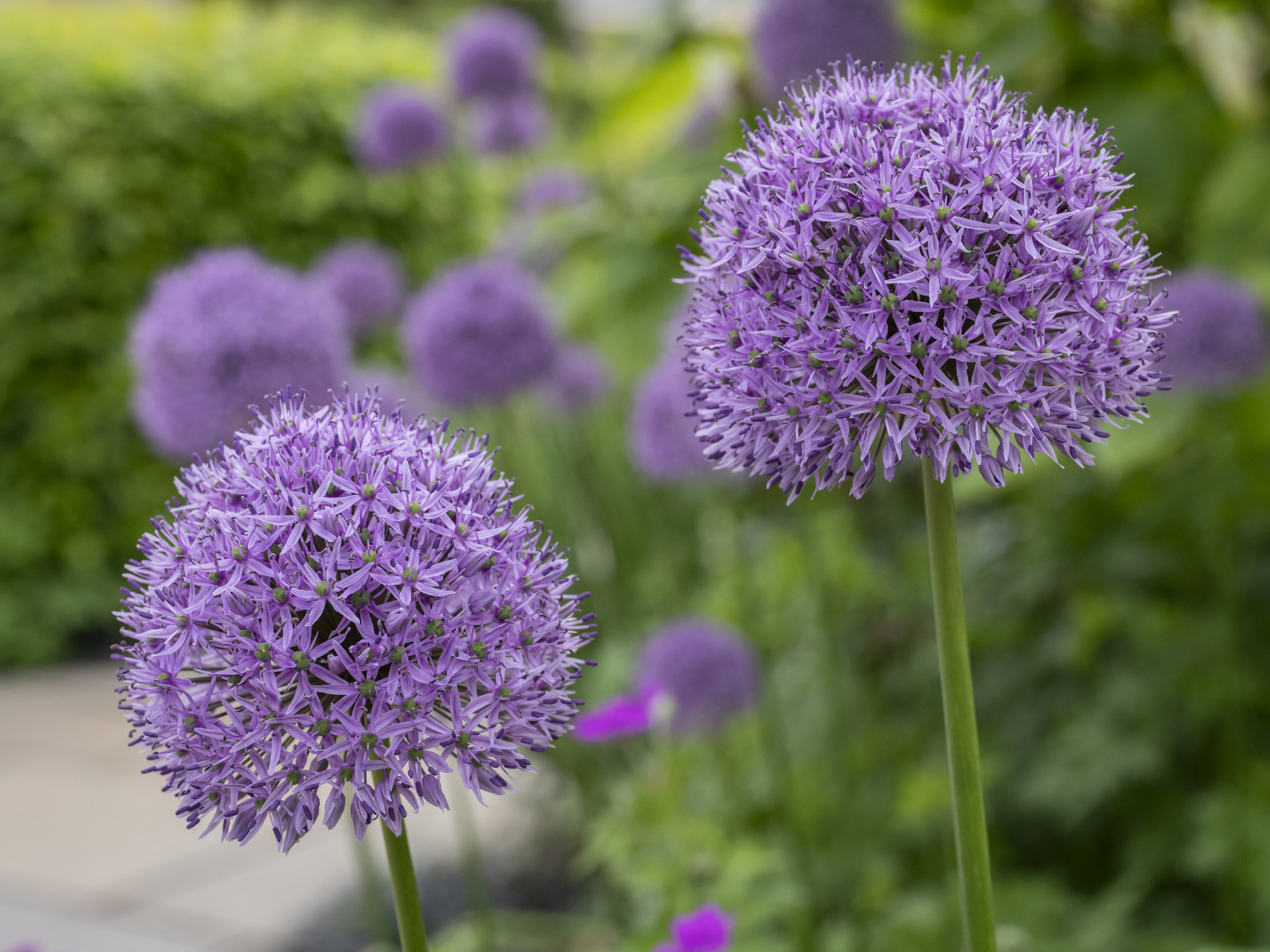 Highlights this month include pom-poms of lavender alliums, the vivid purple spires of Verbascum phoeniceum ‘Violetta’ and the early flowering rose Rosa Olivia Rose Austin.