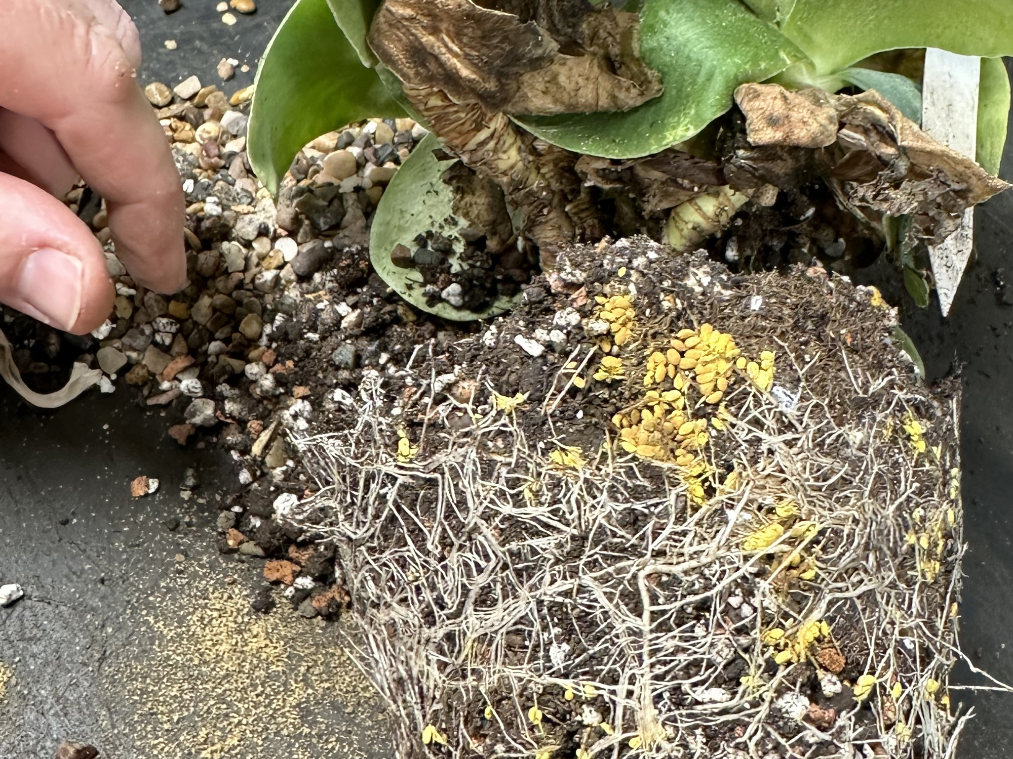 Once your plant is de-potted, here is what to look out for: Golden root mealybugs