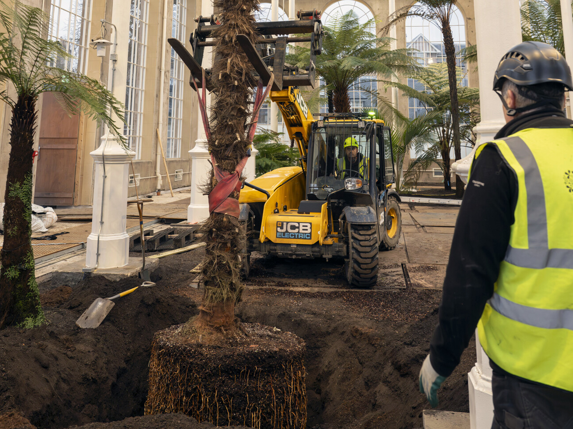 After four years of restoration work, our Horticulture team is finally replanting the Palm Houses, starting with large palms and tree ferns including an enormous Trachycarpus princeps or stone gate palm.