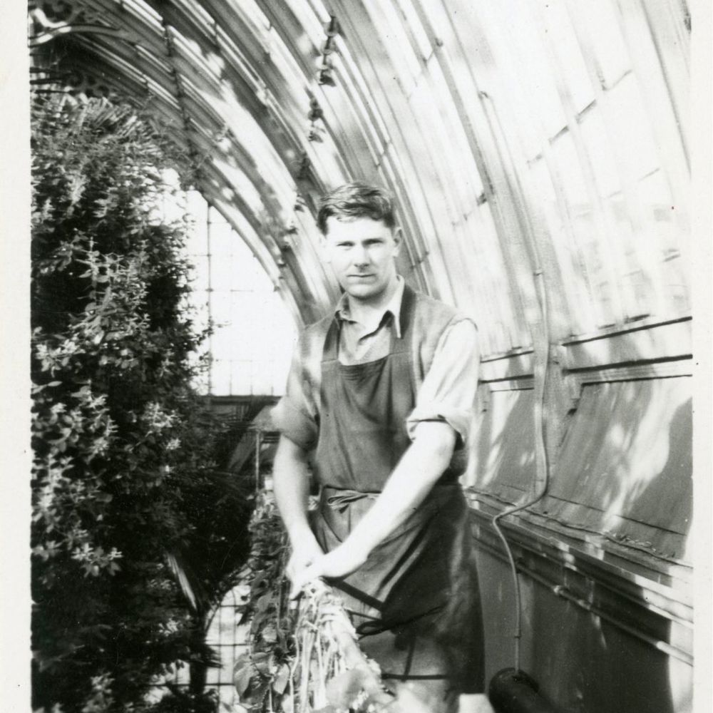 High on the gallery of the Temperate Palm House in 1937, gardener Harry Moseley takes a break from work