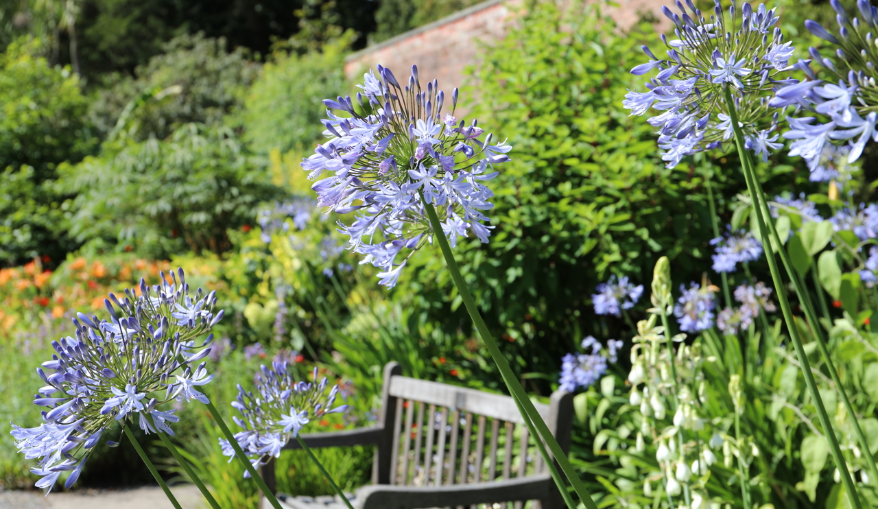 In summer the air is filled with scent as more Maddenii rhododendrons burst into bloom and nectar oozes from the vibrant scarlet flowers of the Southern Rata. The exotic foliage of the tree ferns and cabbage palms mingles with the wealth of spectacular flowering plants to make Logan a true garden-lover's paradise. Colourful borders line the paths of the Walled Garden and more than 30 species of fuchsia come into flower. Look out too for the climbing pastel-coloured daisies from Africa and the Canary Islands on the centre wall, and the brilliant display provided by the orange, red and yellow candelabra primulas. Gladiolus papilio, with its delicate pale purple flowers, can be seen in the beds around the pond, while the elegant pale-orange flowers of the Hedychium spicatum, a member of the ginger family, provide another flush of summer colour in the perimeter border.